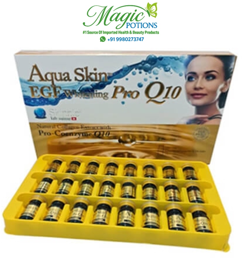 Aqua Skin EGF whitening Pro Q10 is similar to Aqua skin egf gold however it has additional ingredient like pro co enzyme Q10 10000mg, moreover it has 24 vials per box instead of 18 vial. Aqua Skin EGF whitening Pro Q10 is the finest lightening solution to offer your skin more whitening, more firm and mend your skin to be completely FLAWLESS